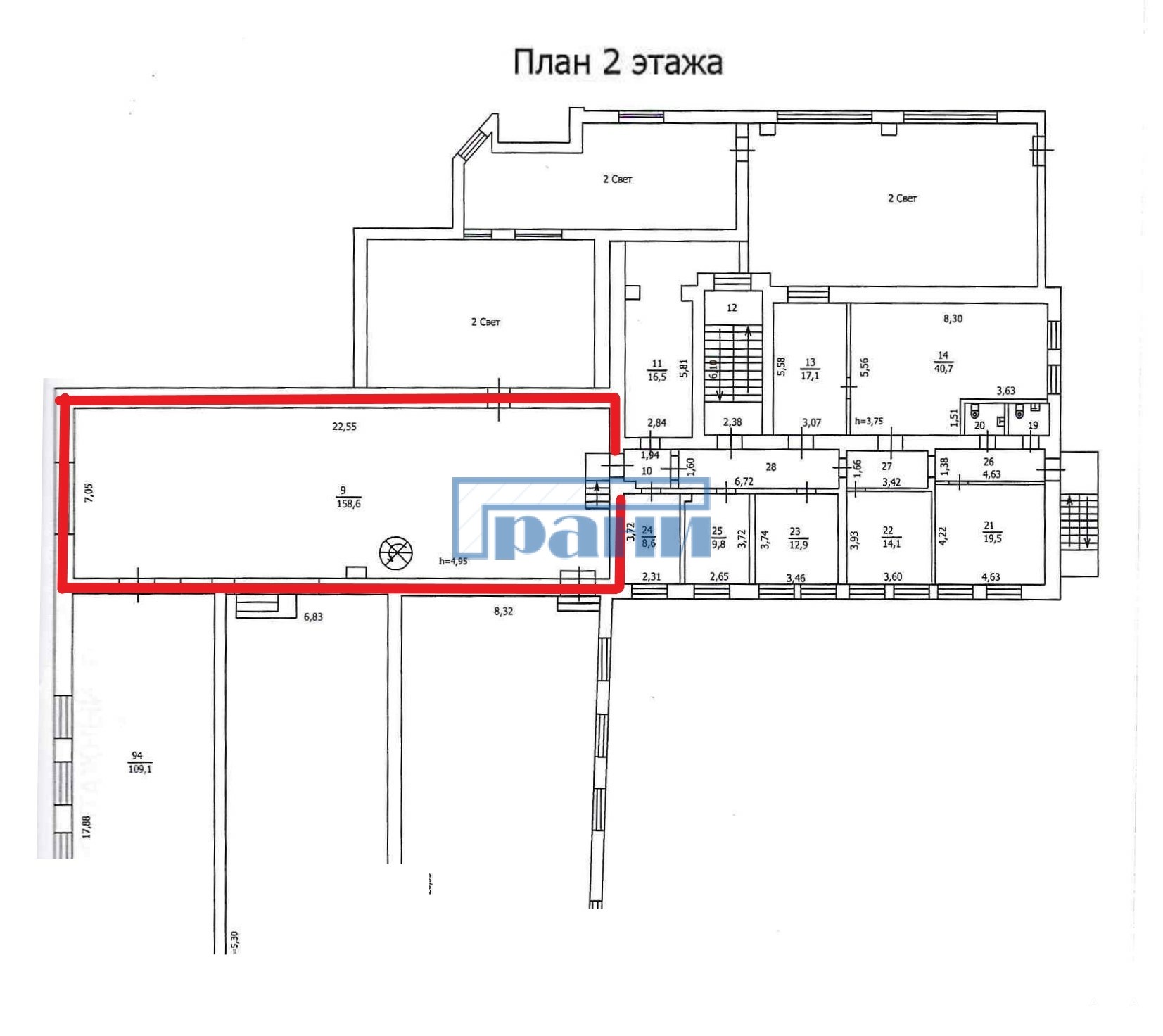Высота потолков - 4-5 м;