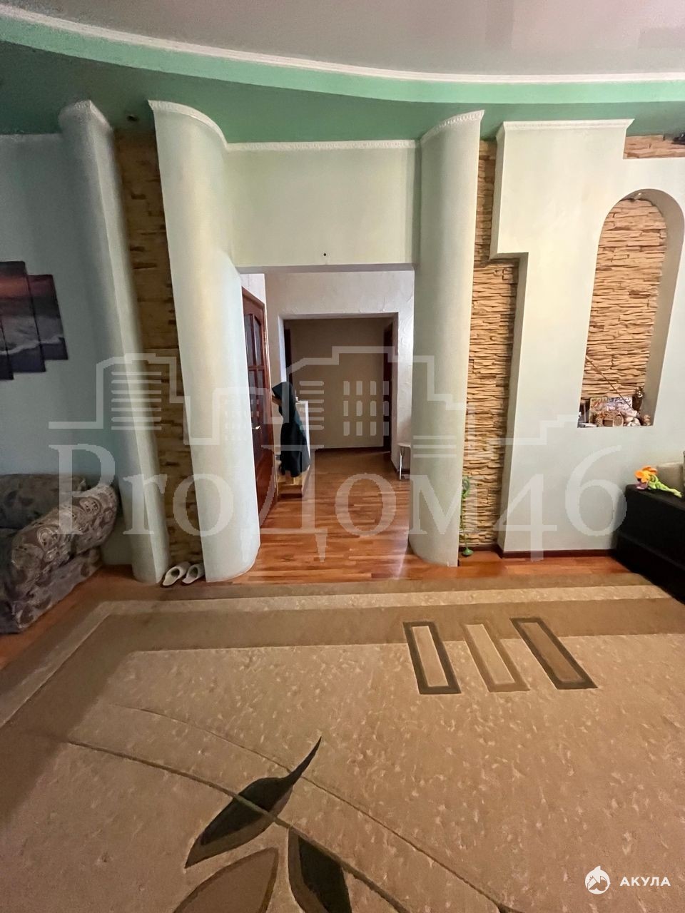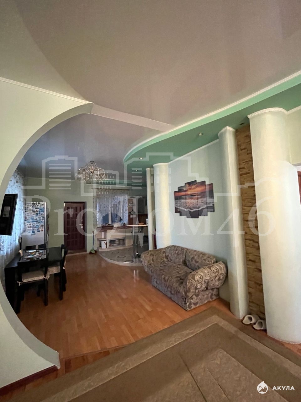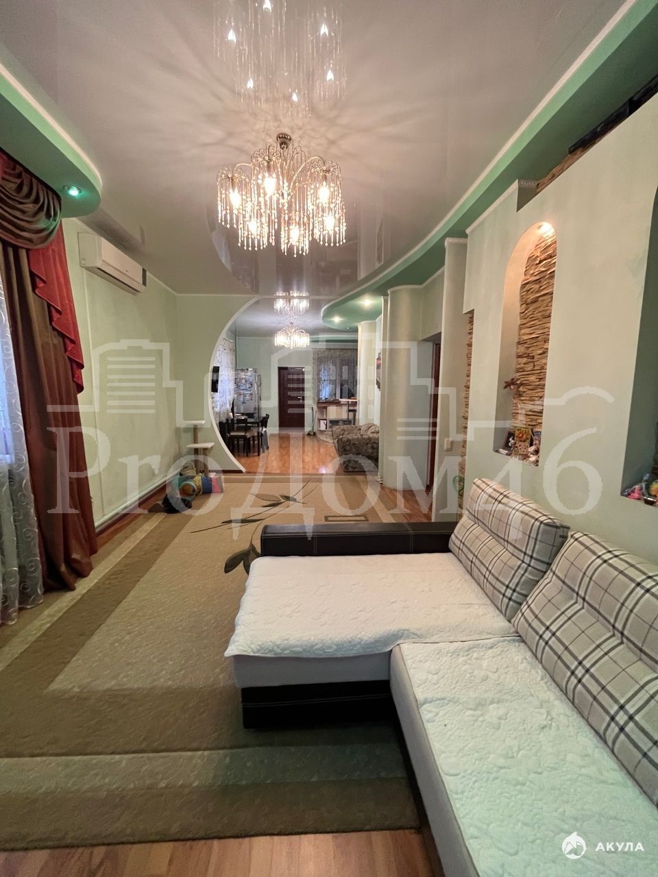 Внутренняя отделка выполнена в дизайнерском стиле: фактурная штукатурка стен, натяжные потолки и ламинат. В доме установлено четыре кондиционера, бойлер на 200 литров и насос.