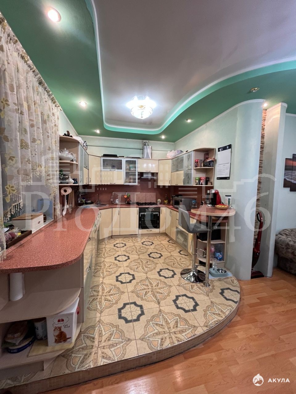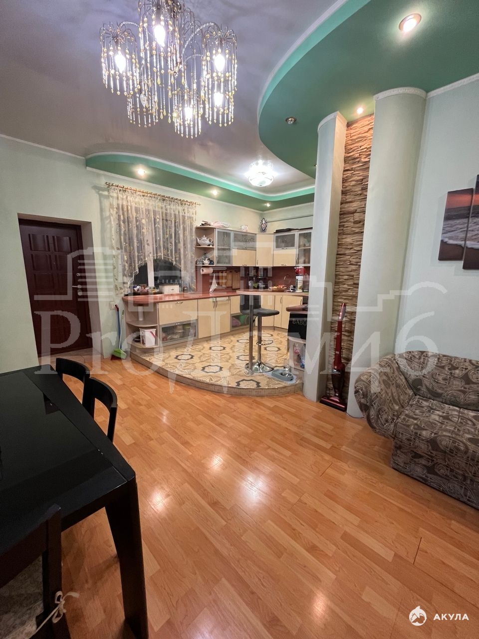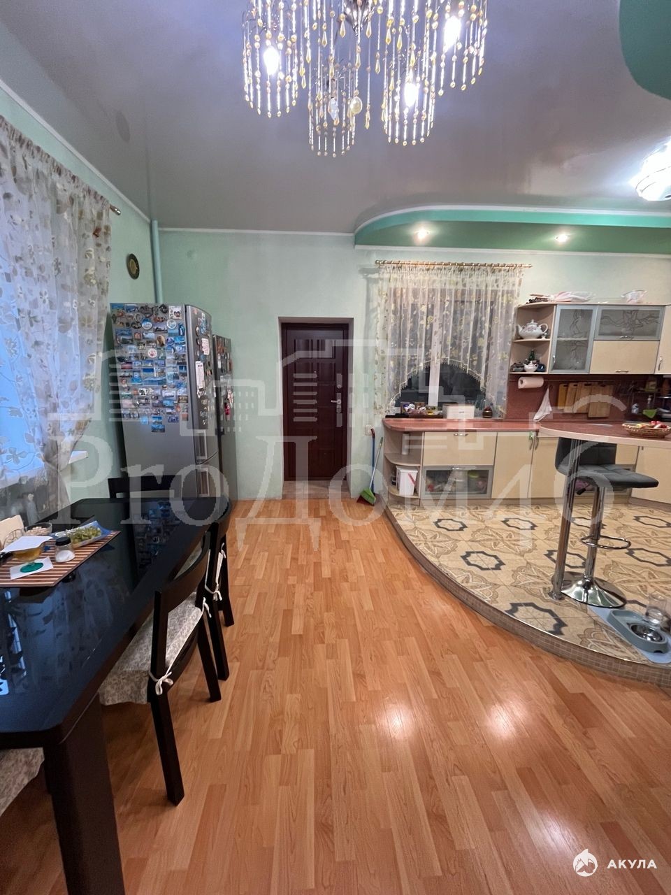 Внутренняя отделка выполнена в дизайнерском стиле: фактурная штукатурка стен, натяжные потолки и ламинат. В доме установлено четыре кондиционера, бойлер на 200 литров и насос.