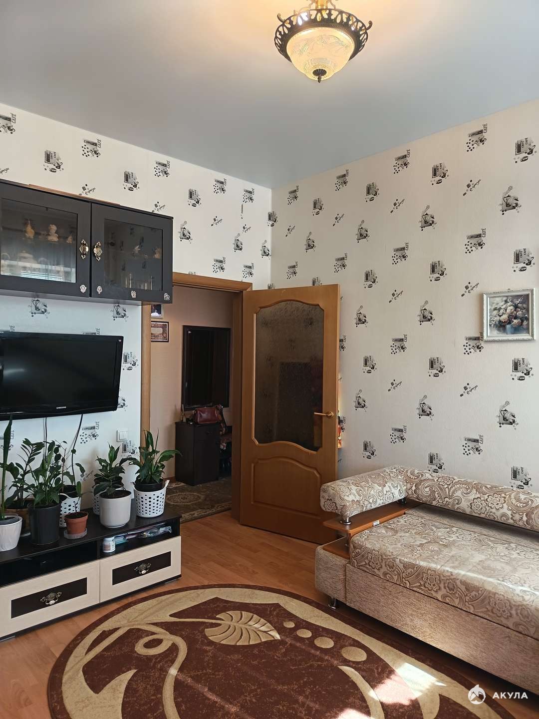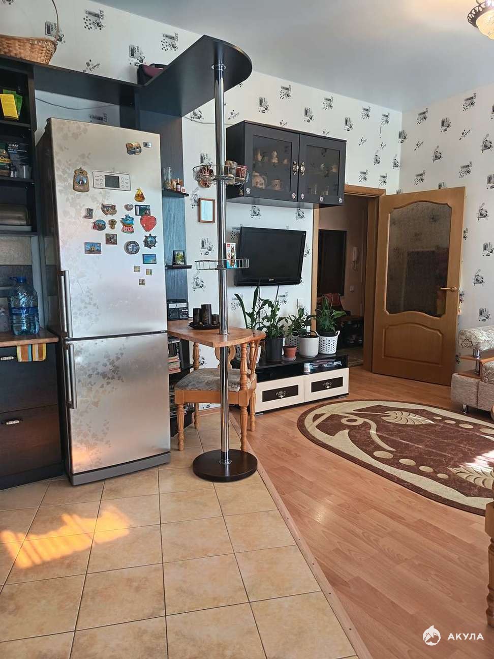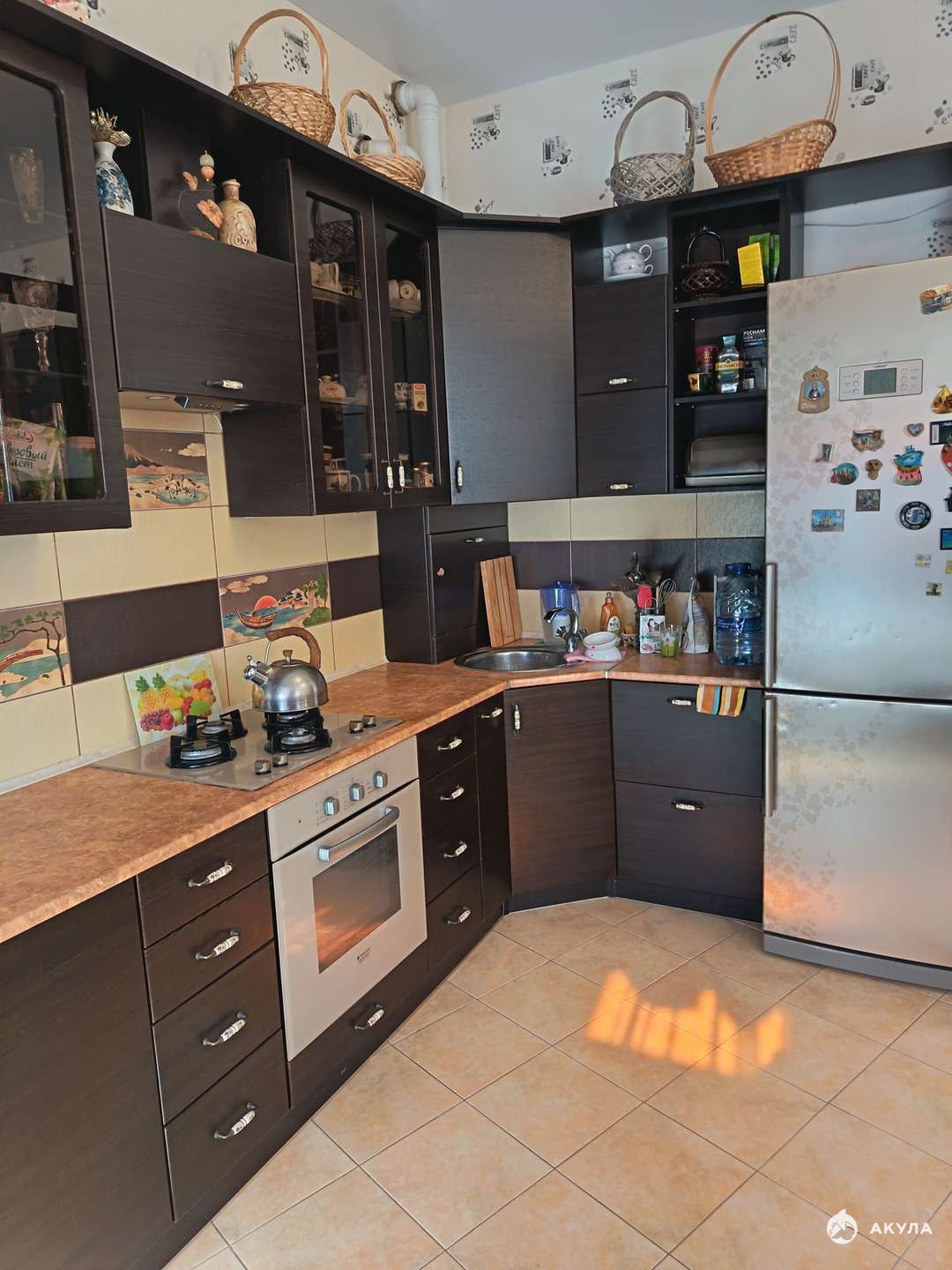 В подарок новому собственнику остается кухонный гарнитур с варочной панелью, духовым шкафом и вытяжкой, стиральная машинка, шкаф в комнате и карнизы.