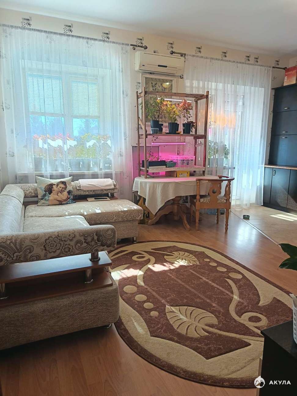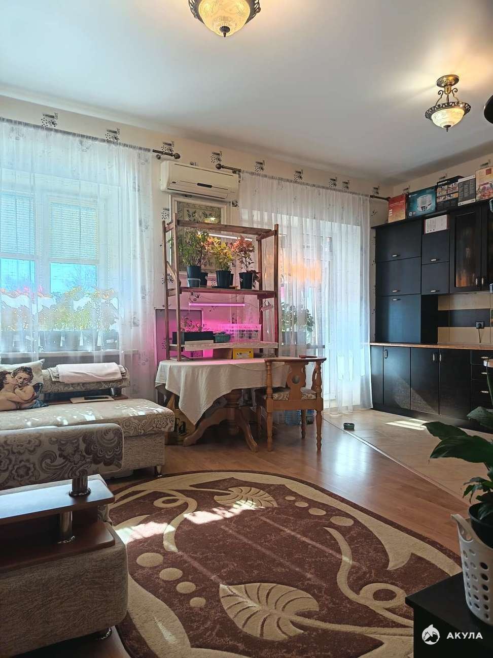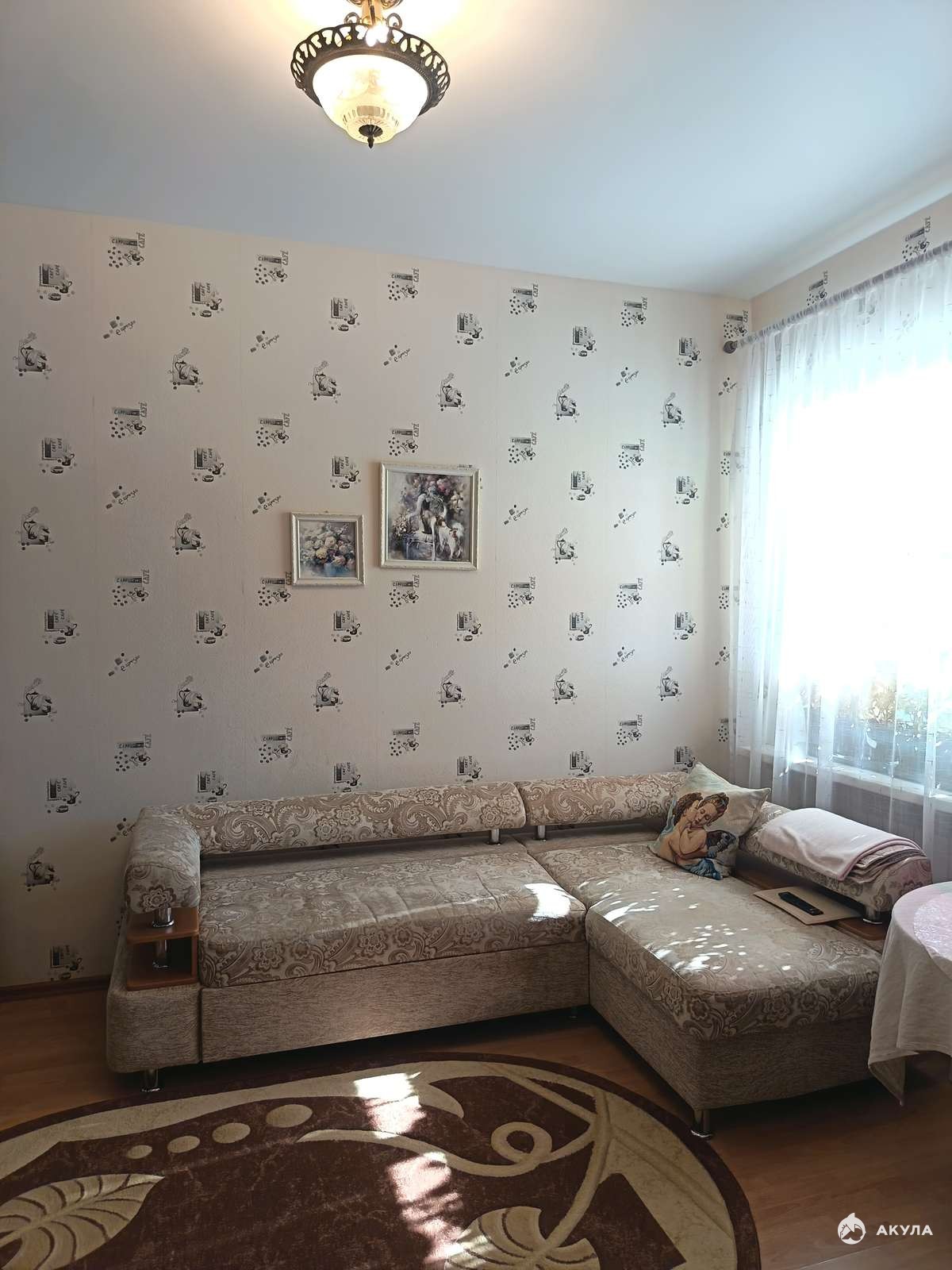 В подарок новому собственнику остается кухонный гарнитур с варочной панелью, духовым шкафом и вытяжкой, стиральная машинка, шкаф в комнате и карнизы.