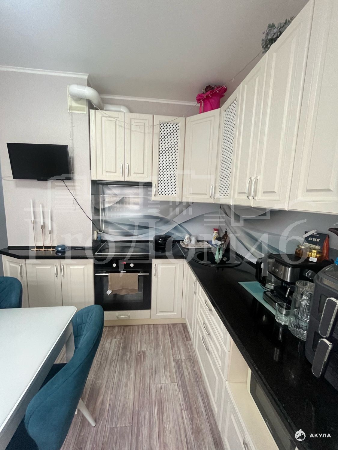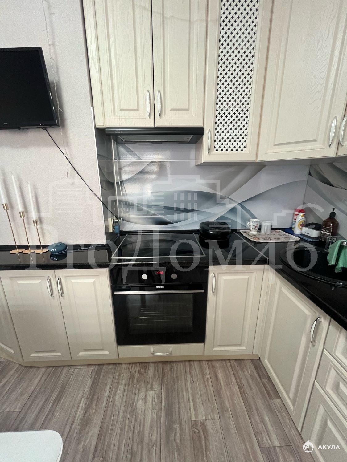 Санузел выполнен в современном стиле и оснащен качественной отделкой.Практичный кухонный гарнитур со встроенной техникой. В каждую комнату проведено телевидение, а в гостиной есть кондиционер. Для хранения вещей предусмотрена просторная гардеробная.