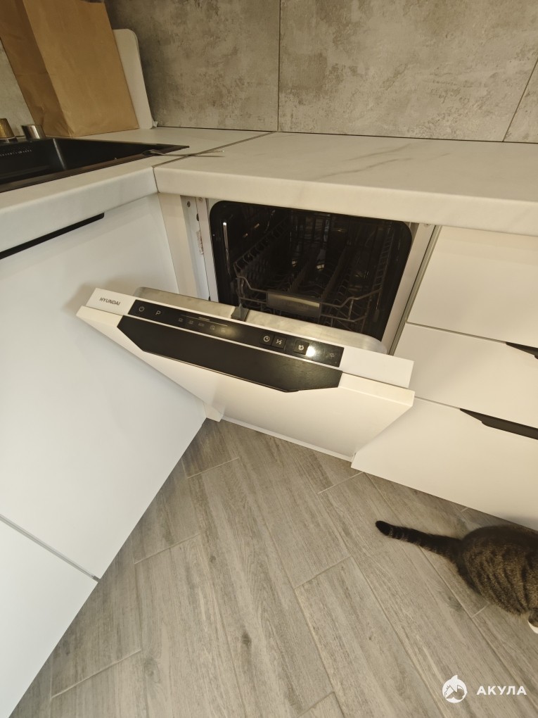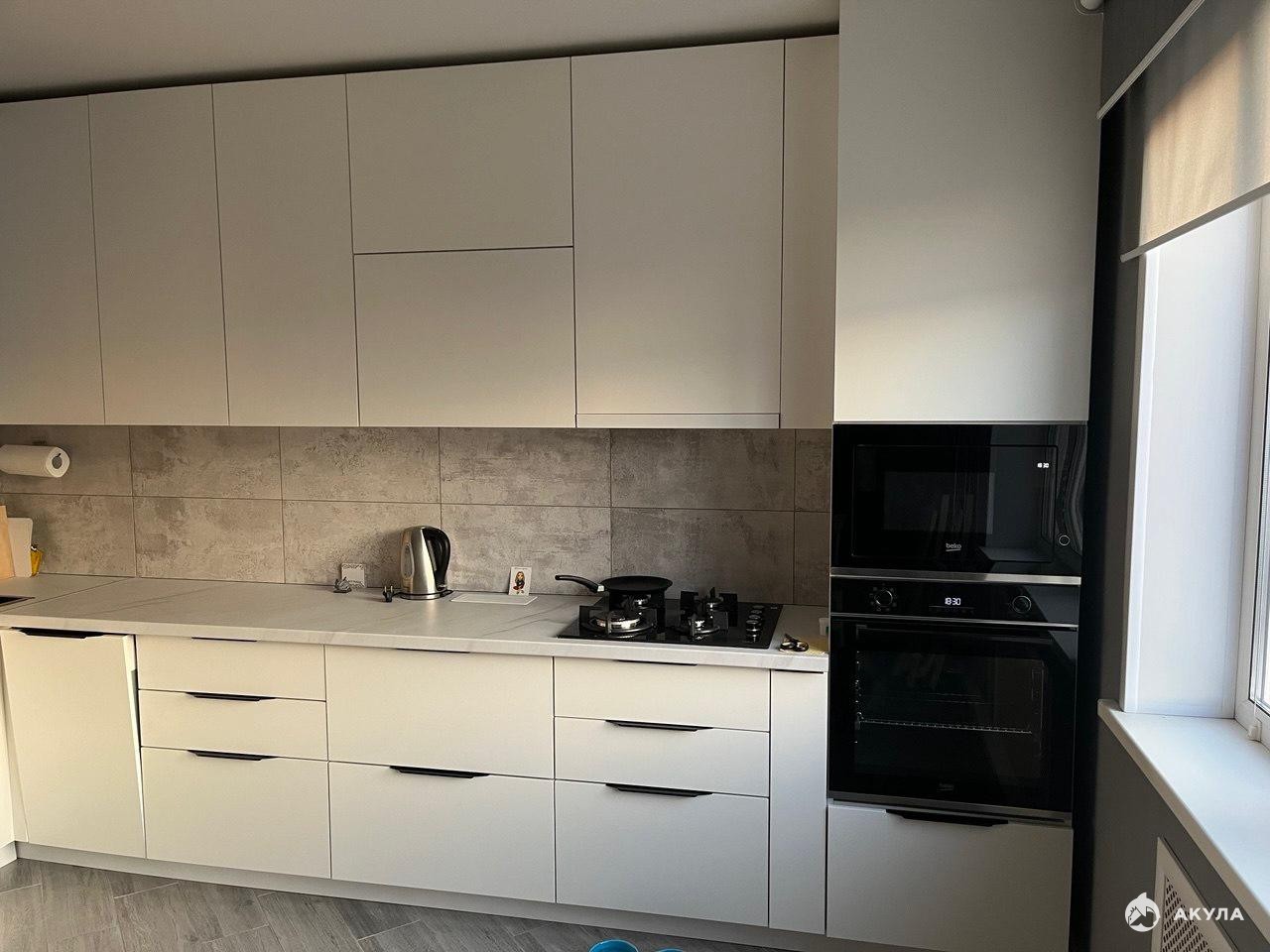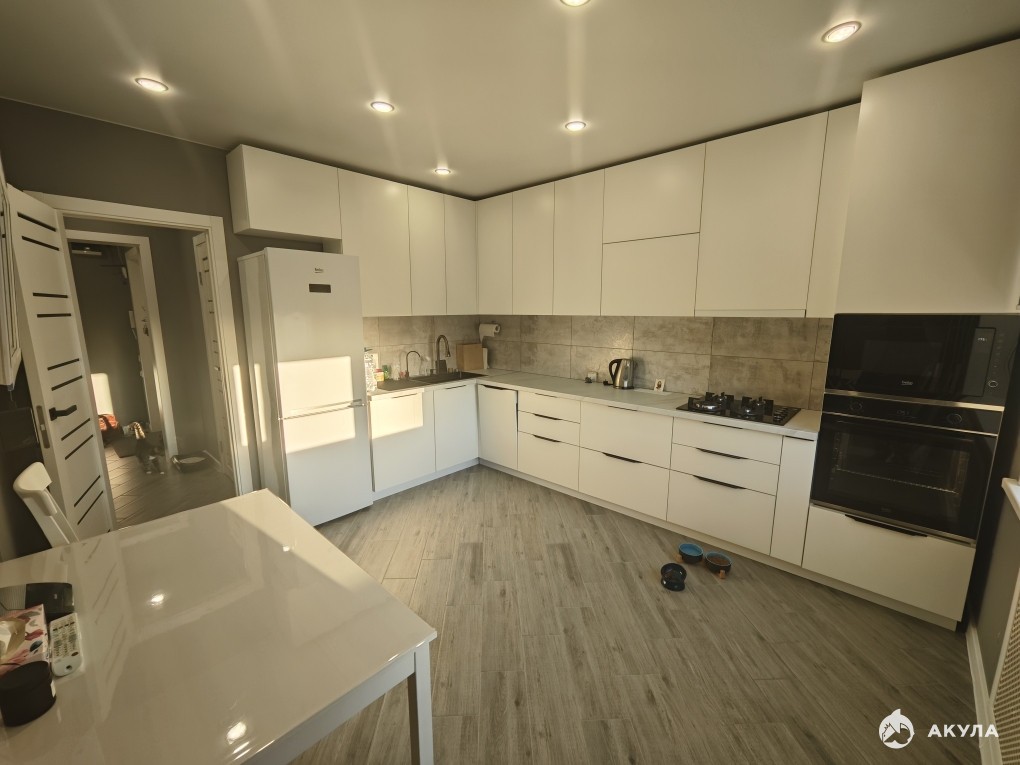 Встроенный кухонный гарнитур с бытовой техникой: встраиваемоя микроволновая печь , духовой шкаф , варочная панель, посудомоечная машинка, скрытые розетки в столешнице, холодильник.