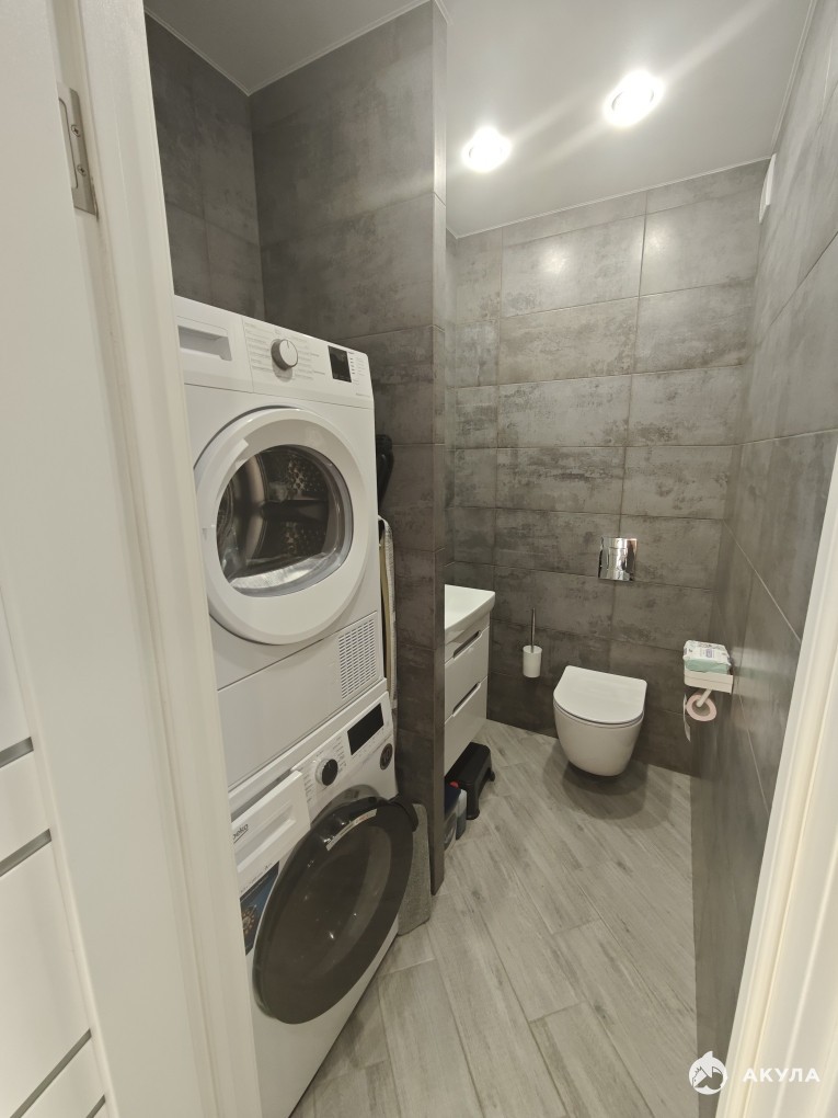 Ванная и с/у отделаны керамогранитом. В ванной установлена душевая перегородка, бойлер, В с/узле предусмотрена зона под стиральную машинку и сушильную машинку, так же установлен раковина и зеркало.